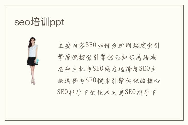 所屬分類 文件大小 5584 KB 下載地址 相關(guān)資料 SEO培訓(xùn)完整版(ppt 45頁)內(nèi)容簡介 主要內(nèi)容 1、SEO簡介 什么是SEO? SEO產(chǎn)生的背景和未來 為什么做SEO? 2、搜