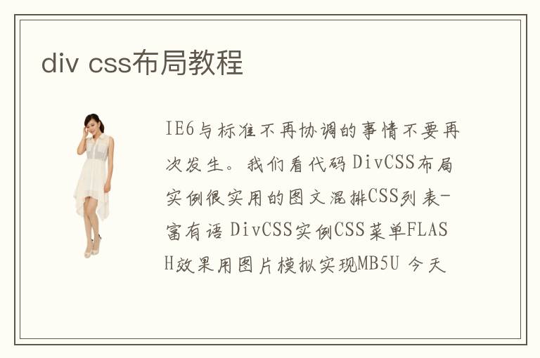 IE6與標(biāo)準(zhǔn)不再協(xié)調(diào)的事情不要再次發(fā)生。我們看代碼 DivCSS布局實例很實用的圖文混排CSS列表-富有語 DivCSS實例CSS菜單FLASH效果用圖片模擬實現(xiàn)MB5U 今天有人