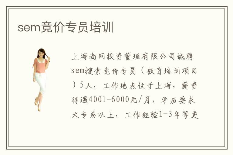 上海尚網(wǎng)投資管理有限公司誠聘sem搜索競價專員(教育培訓(xùn)項目)5人,工作地點位于上海,薪資待遇4001-6000元/月,學(xué)歷要求大專或以上,工作經(jīng)驗1-3年等更多招聘信息請點