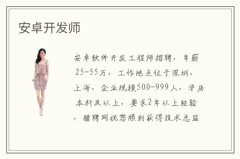 安卓軟件開發(fā)工程師招聘,年薪 25-55萬,工作地點(diǎn)位于深圳,上海,企業(yè)規(guī)模500-999人,學(xué)歷 本科及以上,要求2年以上經(jīng)驗(yàn),獵聘網(wǎng)祝您順利獲得技術(shù)總監(jiān)職位,技術(shù)總