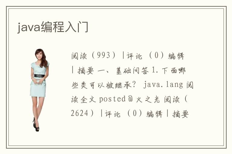 閱讀(993) |評(píng)論 (0)編輯 | 摘要 一、基礎(chǔ)問(wèn)答 1.下面哪些類可以被繼承? java.lang 閱讀全文 posted @ 火之光 閱讀(2624) |評(píng)論 (0)編輯 | 摘要 網(wǎng)絡(luò)編程 網(wǎng)絡(luò)編程對(duì)