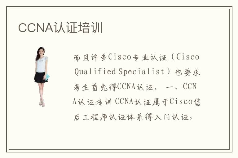 而且許多Cisco專業(yè)認(rèn)證(Cisco Qualified Specialist)也要求考生首先得CCNA認(rèn)證。 一、CCNA認(rèn)證培訓(xùn) CCNA認(rèn)證屬于Cisco售后工程師認(rèn)證體系得入門認(rèn)證,通過CCNA可以