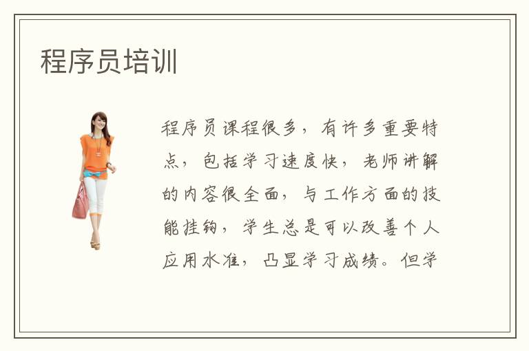 程序員課程很多,有許多重要特點(diǎn),包括學(xué)習(xí)速度快,老師講解的內(nèi)容很全面,與工作方面的技能掛鉤,學(xué)生總是可以改善個人應(yīng)用水準(zhǔn),凸顯學(xué)習(xí)成績。但學(xué)生在學(xué)習(xí)時,應(yīng)該把握住學(xué)習(xí)的目標(biāo)方向,關(guān)注更多具體的思路,積極做好自己的總結(jié),如果實(shí)在沒有辦法,可以考慮程序員培訓(xùn)課程,相信會有許多改善的空間。程序員培訓(xùn)專業(yè)嗎,程序員培訓(xùn)機(jī)構(gòu)有很好的課程內(nèi)容,每一種課程都已經(jīng)過老師的嚴(yán)格篩選,提供專業(yè)的個性化教學(xué)方案,收獲往往更加顯著。程序員培訓(xùn)方式比較多,包括1對1教學(xué)、線上教學(xué)以及上門教學(xué)等等,許多學(xué)生缺乏應(yīng)用的培訓(xùn),沒有良好的學(xué)習(xí)基礎(chǔ),經(jīng)驗(yàn)不夠多,課程也不夠完善,經(jīng)過老師的細(xì)致指導(dǎo)后,進(jìn)步空間更大,學(xué)習(xí)目標(biāo)更加明確,改善效果更好。