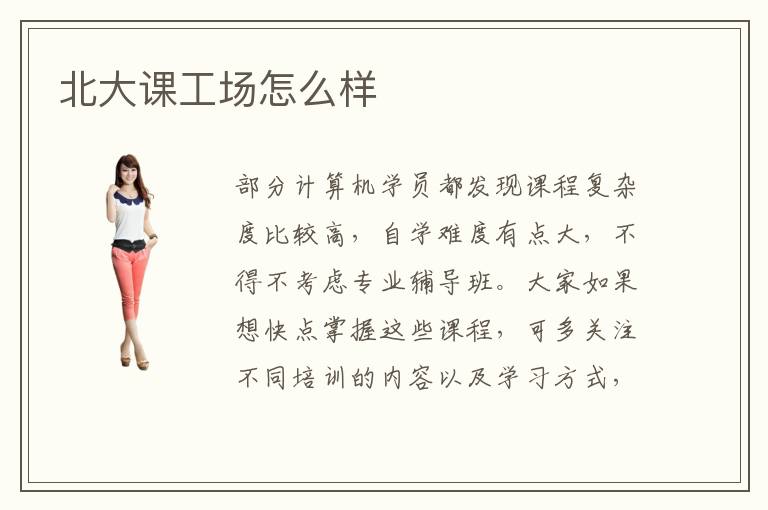 部分計(jì)算機(jī)學(xué)員都發(fā)現(xiàn)課程復(fù)雜度比較高,自學(xué)難度有點(diǎn)大,不得不考慮專業(yè)輔導(dǎo)班。大家如果想快點(diǎn)掌握這些課程,可多關(guān)注不同培訓(xùn)的內(nèi)容以及學(xué)習(xí)方式,找到較靠譜的培訓(xùn)類型,收獲滿意的學(xué)習(xí)效果。另外,一般情況下,補(bǔ)習(xí)班的學(xué)生還應(yīng)該要投入更多時(shí)間和精力,認(rèn)真總結(jié),不要總是三天打魚、兩天曬網(wǎng),或者急于求成。北大課工場怎么樣,一方面在于知名度高,有完善的教學(xué)形式,也關(guān)注學(xué)生的興趣,制定明確的目標(biāo),學(xué)習(xí)成績擁有顯著變化,另外一方面在于北大課工場補(bǔ)習(xí)方式非常豐富,包括遠(yuǎn)程教學(xué)、個(gè)性化的一對(duì)一教學(xué)等等,充分體現(xiàn)出北大課工場技術(shù)水平,短時(shí)間內(nèi)得到非常好的學(xué)習(xí)效果。當(dāng)然,老師會(huì)結(jié)合學(xué)生進(jìn)展,調(diào)整學(xué)習(xí)速度,讓學(xué)生的接受的效果更好。