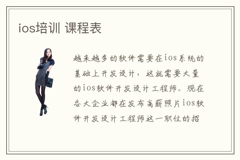 越來越多的軟件需要在ios系統(tǒng)的基礎上開發(fā)設計,這就需要大量的ios軟件開發(fā)設計工程師。現(xiàn)在各大企業(yè)都在發(fā)布高薪照片ios軟件開發(fā)設計工程師這一職位的招聘廣告,但是ios的學習需要一定的基礎,門檻比較高,沒有經過專業(yè)學習的人并不能勝任ios軟件開發(fā)設計工程師這一職位,這就造成了這一類人才“供不應求”的現(xiàn)象。那么正規(guī)專業(yè)的ios培訓機構課程表是什么樣的呢?