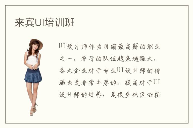 UI設(shè)計師作為目前最高薪的職業(yè)之一,學(xué)習(xí)的隊伍越來越強大,各大企業(yè)對于專業(yè)UI設(shè)計師的待遇也是非常豐厚的。提高對于UI設(shè)計師的培養(yǎng),是很多地區(qū)都在計劃的事情,因此越來越多的投資商開始投資成立了很多大大小小不同品牌的專業(yè)UI培訓(xùn)機構(gòu)。那么,你知道來賓UI培訓(xùn)班嗎?你覺得來賓UI培訓(xùn)班的教學(xué)質(zhì)量好不好呢?來賓UI培訓(xùn)班是很多人選擇學(xué)習(xí)UI設(shè)計的平臺,相信大家的眼光是正確的。