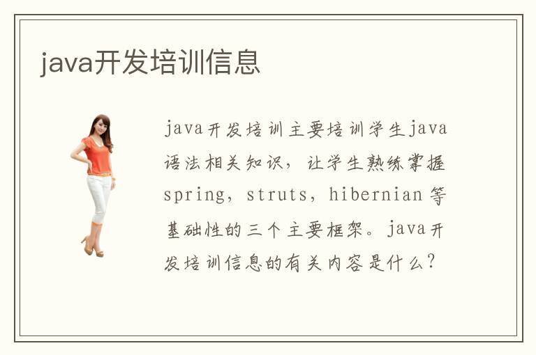 java開發(fā)培訓主要培訓學生java語法相關(guān)知識,讓學生熟練掌握spring,struts,hibernian 等基礎(chǔ)性的三個主要框架。java開發(fā)培訓信息的有關(guān)內(nèi)容是什么?JAVA開發(fā)培訓中心的相關(guān)信息一般發(fā)布在哪里?java基礎(chǔ)是學習成為工程師的必要前提,java需要靈活的邏輯思維模式和不斷創(chuàng)新的設(shè)計模式。java設(shè)計師需要學習java語法基礎(chǔ),關(guān)注JAVA開發(fā)培訓信息。