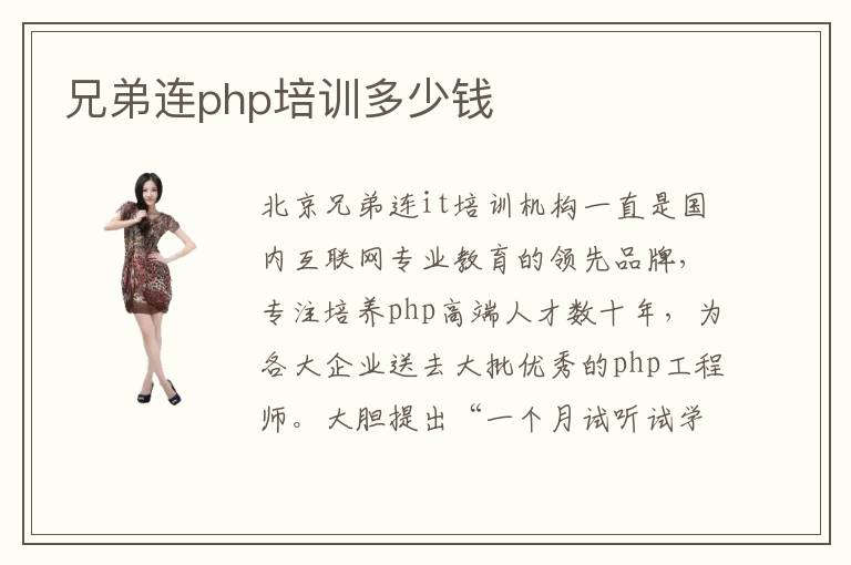 北京兄弟連it培訓機構(gòu)一直是國內(nèi)互聯(lián)網(wǎng)專業(yè)教育的領先品牌,專注培養(yǎng)php高端人才數(shù)十年,為各大企業(yè)送去大批優(yōu)秀的php工程師。大膽提出“一個月試聽試學”的方案,幫助學生認清自己究竟適不適合學習php,不適合的同學可以不學不交費,這也是兄弟連對于自己教學質(zhì)量的信任。那么,兄弟連php培訓需要學費多少錢呢?不了解的同學可以咨詢在線老師。