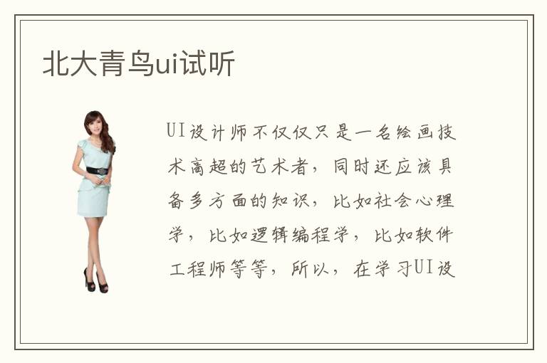 UI設(shè)計(jì)師不僅僅只是一名繪畫技術(shù)高超的藝術(shù)者,同時(shí)還應(yīng)該具備多方面的知識(shí),比如社會(huì)心理學(xué),比如邏輯編程學(xué),比如軟件工程師等等,所以,在學(xué)習(xí)UI設(shè)計(jì)的前期,我們總是會(huì)有這樣那樣的困惑,不知道自己是否能夠有學(xué)習(xí)ui設(shè)計(jì)的堅(jiān)持毅力。北大青鳥UI設(shè)計(jì)培訓(xùn)學(xué)校提供了試聽的課堂模式。北大青鳥UI試聽效果怎么樣?北大青鳥ui試聽有效嗎?