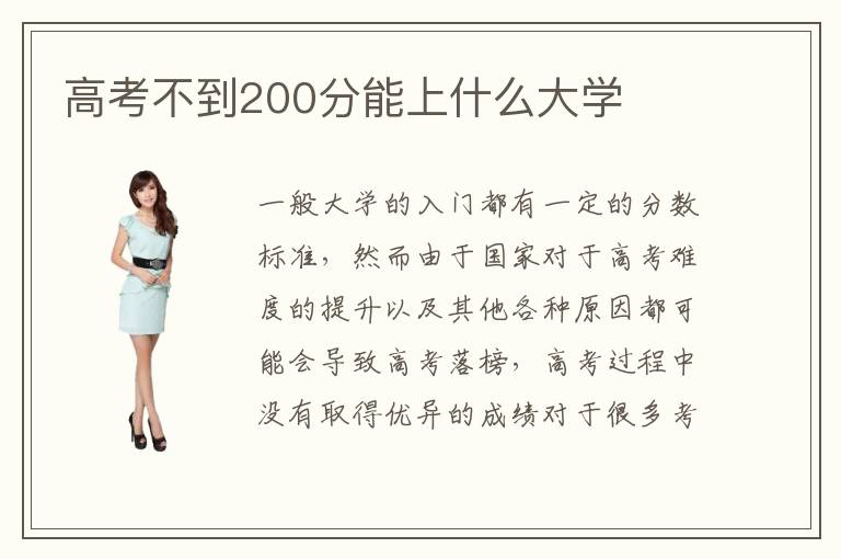 一般大學的入門都有一定的分數(shù)標準,然而由于國家對于高考難度的提升以及其他各種原因都可能會導(dǎo)致高考落榜,高考過程中沒有取得優(yōu)異的成績對于很多考生都會造成影響。那么,高考不到200分能上什么大學呢?高考沒有二百分一般是進入不了普通大學的,名牌大學更是不可能的,然而國內(nèi)各地成立的大專技術(shù)培訓學校是以專業(yè)技術(shù)培訓為主的,都不會存在分數(shù)入門標準的。