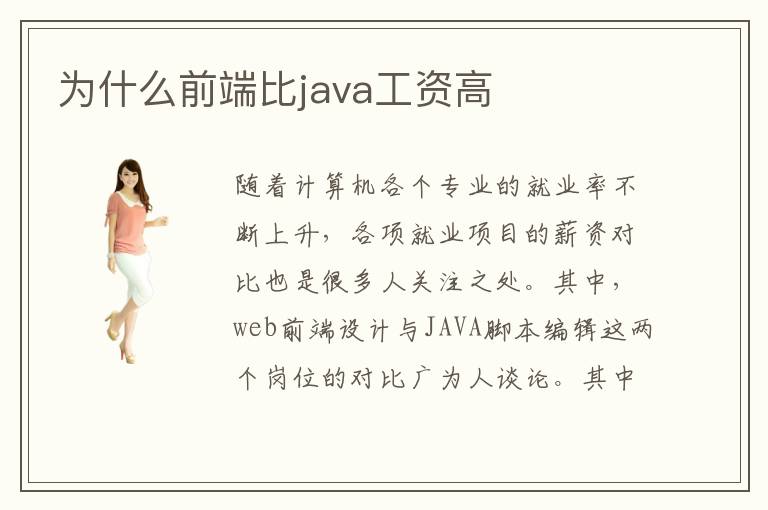 隨著計算機各個專業(yè)的就業(yè)率不斷上升,各項就業(yè)項目的薪資對比也是很多人關注之處。其中,web前端設計與JAVA腳本編輯這兩個崗位的對比廣為人談論。其中,到底是java腳本編程工資高還是web前端的工資高呢?一般情況來說,前端比java的工資要高。為什么前端web比java工資高?是不是web前端設計的工作崗位比java更高端?java與前端工資對比情況。