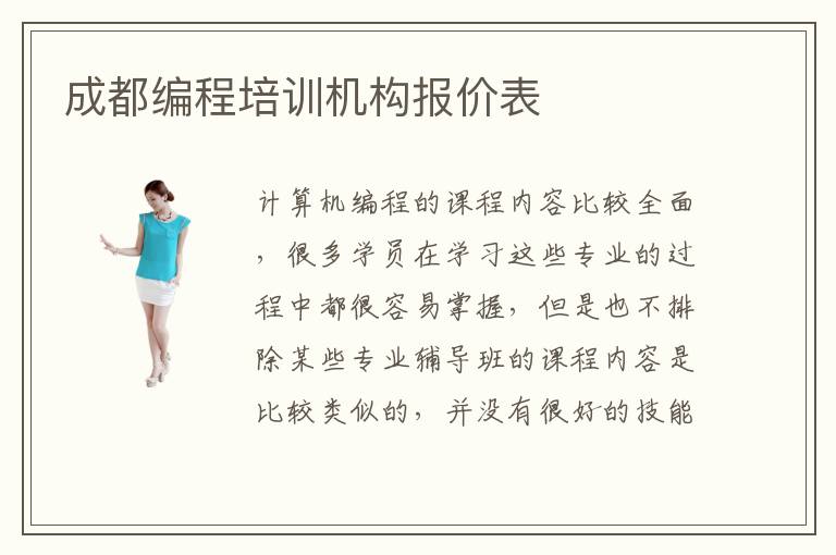計算機編程的課程內(nèi)容比較全面,很多學(xué)員在學(xué)習(xí)這些專業(yè)的過程中都很容易掌握,但是也不排除某些專業(yè)輔導(dǎo)班的課程內(nèi)容是比較類似的,并沒有很好的技能和專業(yè)水準(zhǔn),因此很難保障成果。成都編程培訓(xùn)機構(gòu)報價表其實是參差不齊的,有些機構(gòu)的價格是在2000到5000元,但是也有部分機構(gòu)的費用可能在3000~9000元不等。編程培訓(xùn)機構(gòu)難度大嗎,有部分機構(gòu)的教學(xué)課程能力比較強,因此就算是遇到再難的知識,其實也可以將其簡單化。編程培訓(xùn)機構(gòu)技術(shù)含量往往是學(xué)生都特別關(guān)注的,如果選擇的課程內(nèi)容沒有太高的技術(shù)的能量,那么大多數(shù)人都懂,以后的競爭中當(dāng)然取得不了優(yōu)勢。因此學(xué)生往往都會重視技術(shù)含量和水平較高的計算機編程內(nèi)容,那么大家可以了解更加專業(yè)的計算機編程機構(gòu),老師會根據(jù)每個學(xué)員的能力來進行分析,再制定技術(shù)含量更高的課程,讓學(xué)員在已有的基礎(chǔ)上學(xué)習(xí)高端的知識。