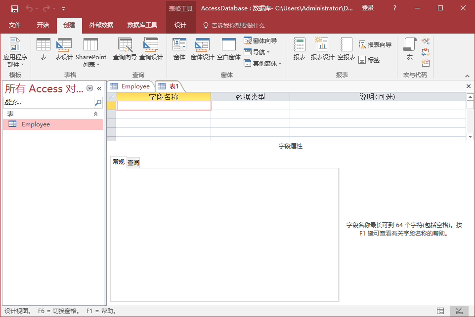 在“表名稱”字段中輸入表的名稱:Employee 后。點(diǎn)擊確定,將在導(dǎo)航窗格中看到您創(chuàng)建的表名稱。