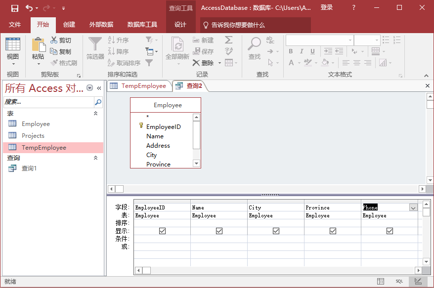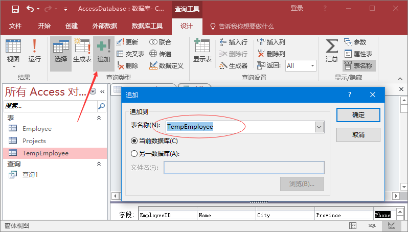 打開查詢設(shè)計,在“表”選項卡的“顯示表”對話框中,雙擊Employees表,然后關(guān)閉對話框。 雙擊想要顯示的字段(與TempEmployees表的字段一致),如下圖所示 -