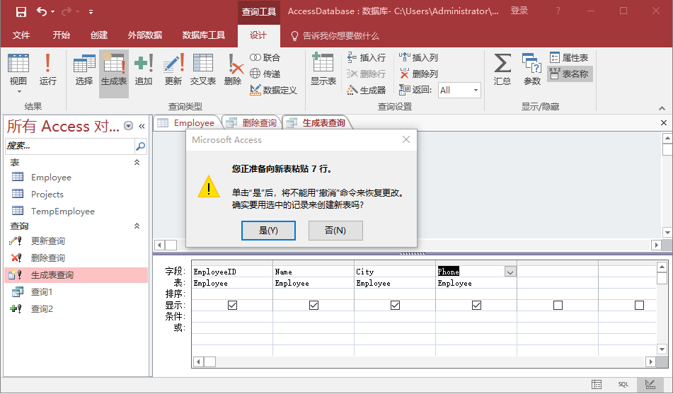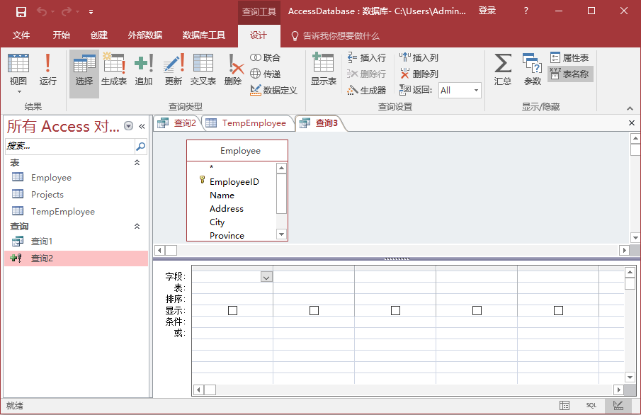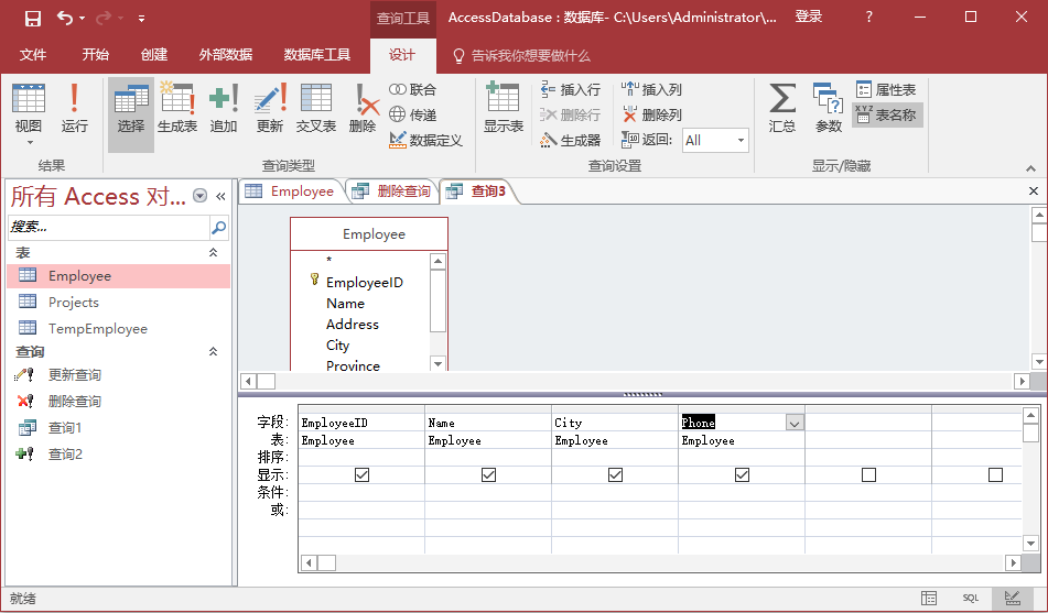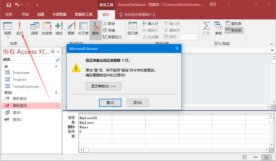 在“設(shè)計(jì)”選項(xiàng)卡的“查詢類型”組中,單擊“刪除”,然后雙擊"EmployeeID"。