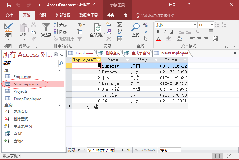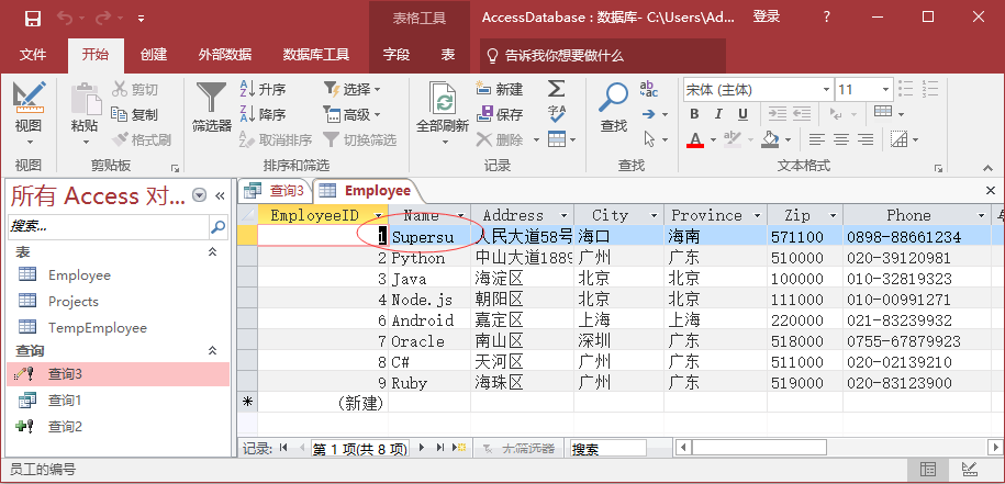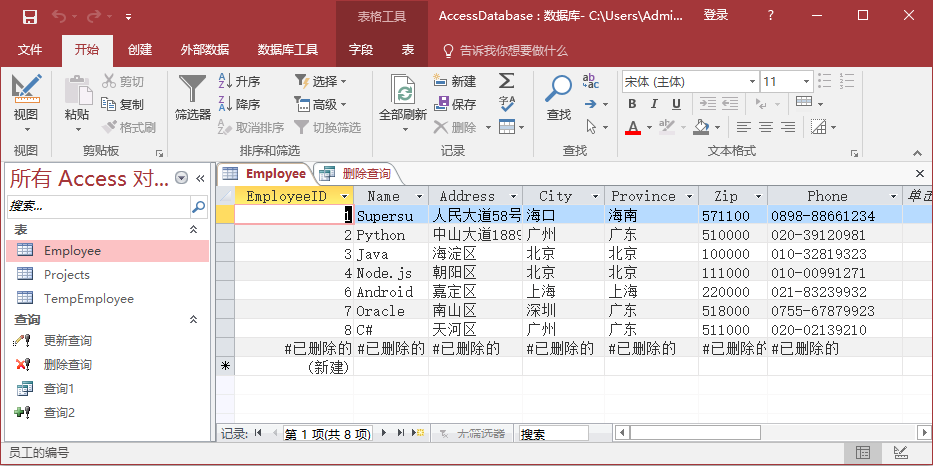 單擊是,進(jìn)入數(shù)據(jù)表視圖,將看到指定的員工記錄現(xiàn)在被刪除。如下圖所示 -