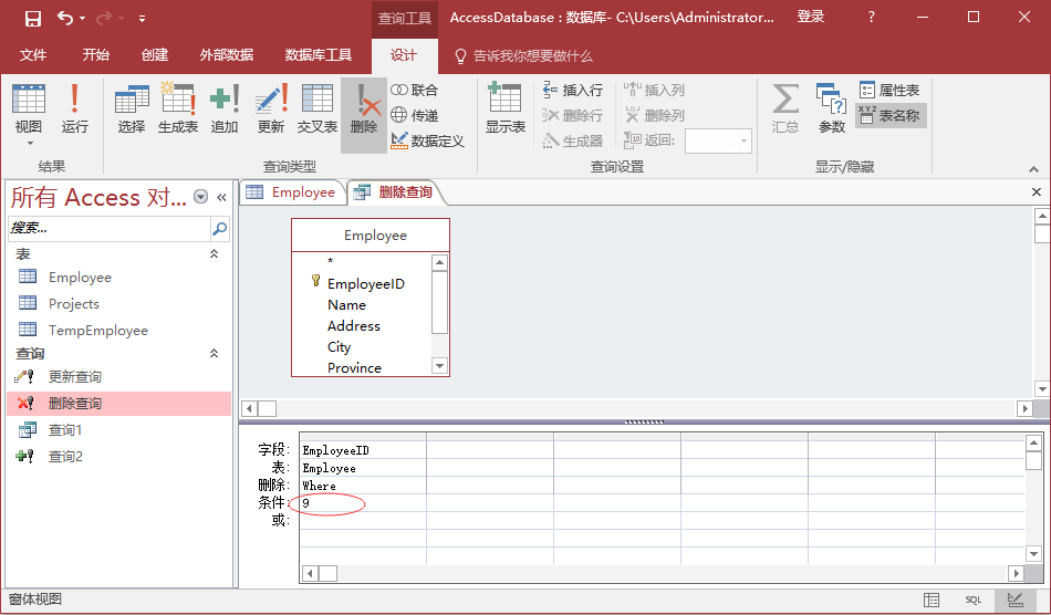 在“設(shè)計(jì)網(wǎng)格”的“條件”行中,鍵入9, 在此,我們要刪除EmployeeID為9的員工。