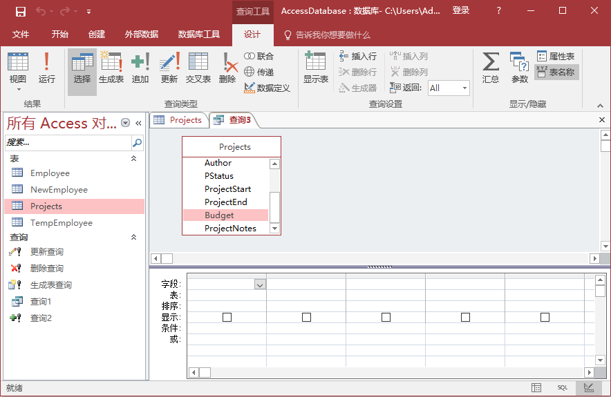 現(xiàn)在通過創(chuàng)建一個(gè)簡單的例子來看看一個(gè)參數(shù)查詢。打開數(shù)據(jù)庫,然后在創(chuàng)建表 選項(xiàng)卡中選擇:查詢設(shè)計(jì)。雙擊Projects表并關(guān)閉顯示對話框。