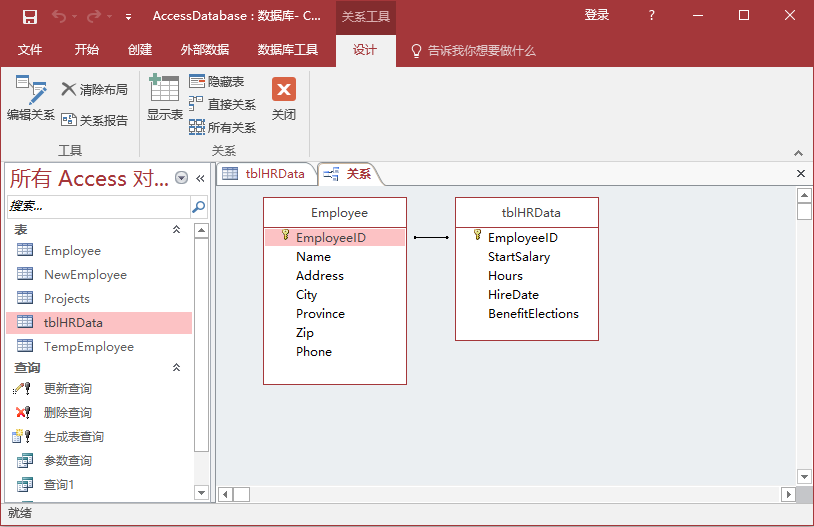 以上窗口將Employees的EmployeeID字段與tblHRData的EmployeeID關(guān)聯(lián)起來(lái)。 現(xiàn)在點(diǎn)擊 創(chuàng)建 按鈕,現(xiàn)在這兩個(gè)表就創(chuàng)建了相關(guān)聯(lián)關(guān)系了。如下圖所示 -