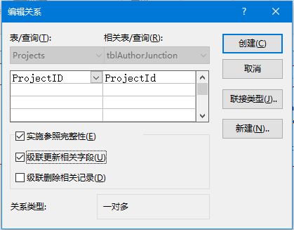 單擊是,現(xiàn)在還需要創(chuàng)建一個聯(lián)連表:tblAuthorJunction。 這個聯(lián)連表有兩個外鍵,如下圖所示。