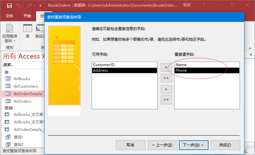 查找重復(fù)查詢向?qū)?/strong>的第一個屏幕將詢問您要搜索哪個表或哪個查詢可能有重復(fù)。假設(shè)要檢查tblCustomers表,以確保同一客戶沒有輸入兩次或多次。 所以,選擇tblCustomers并點(diǎn)擊下一步。