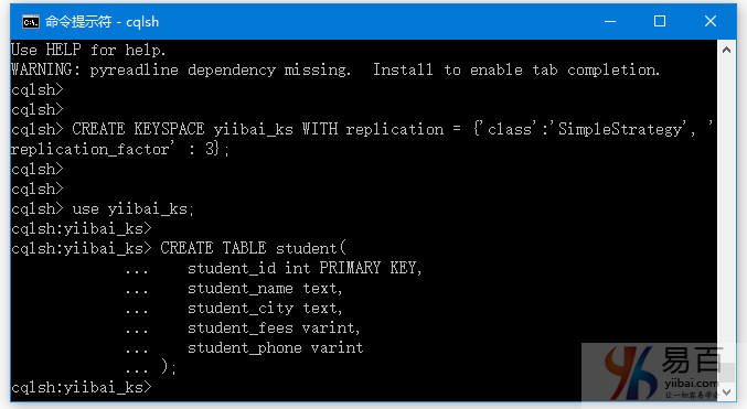 在這里,我們使用前面已經(jīng)創(chuàng)建的鍵空間 - “yiibai_ks”。并使用以下腳本 -