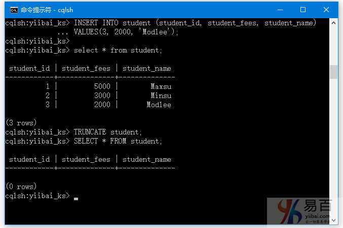 cqlsh:yiibai_ks> INSERT INTO student (student_id, student_fees, student_name)