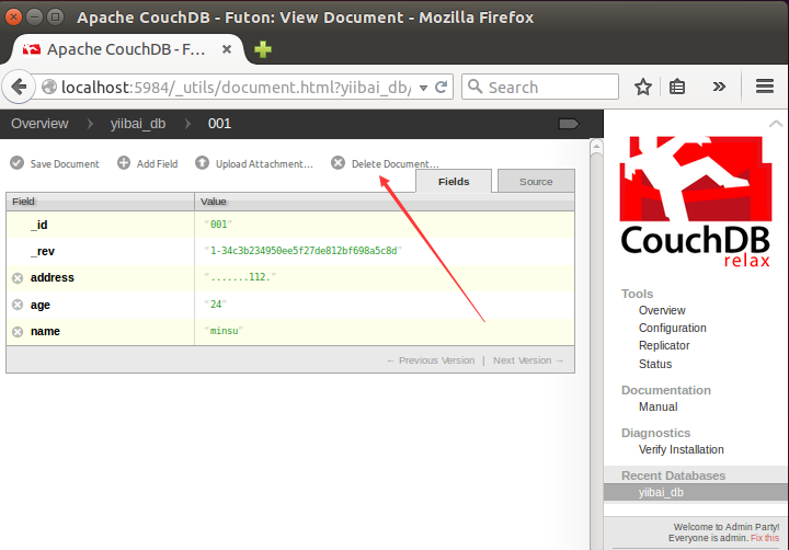 在ID為001的這個(gè)文檔進(jìn)入詳細(xì)信息頁面中,點(diǎn)擊“Delete Document…”來刪除當(dāng)前這條信息,如下所示 -
