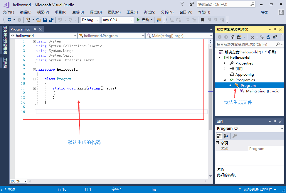 創(chuàng)建完成項(xiàng)目后,也會(huì)自動(dòng)生成文件及代碼,如下所示 -