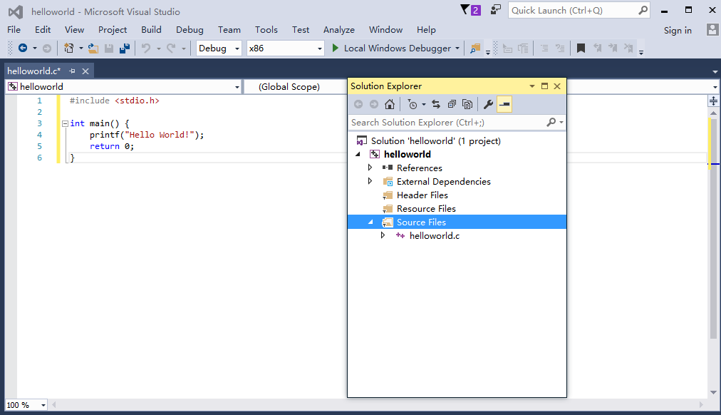 在“Source Files”目錄下創(chuàng)建一個源文件:helloworld.c,其代碼實現(xiàn)如下 -