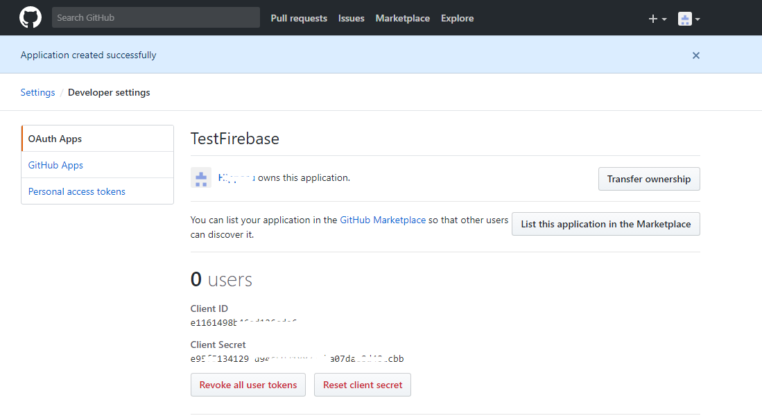 按照此鏈接創(chuàng)建GitHub應(yīng)用程序。 需要將Firebase中的回調(diào)網(wǎng)址復(fù)制到授權(quán)回調(diào)網(wǎng)址字段中。 創(chuàng)建應(yīng)用程序后,需要將客戶端密鑰和客戶端密鑰從GitHub應(yīng)用復(fù)制到Firebase。