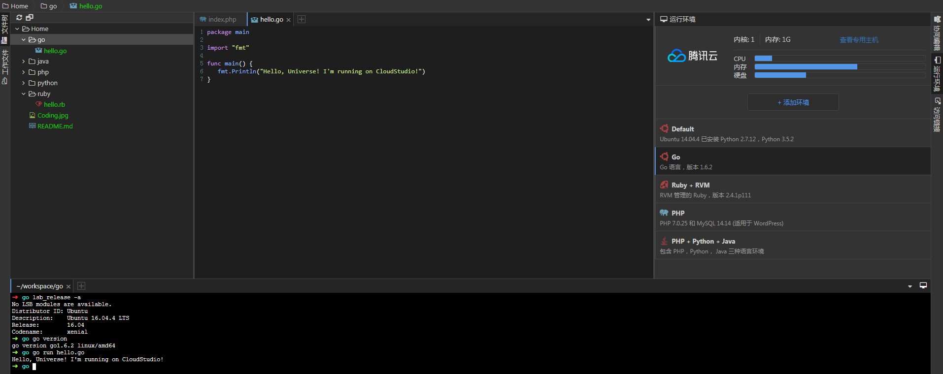 Tips: 從終端中輸入命令可以看出 CloudStudio 為我們集成了 Ubuntu16.04.1 + Go1.6.2 的開(kāi)發(fā)環(huán)境