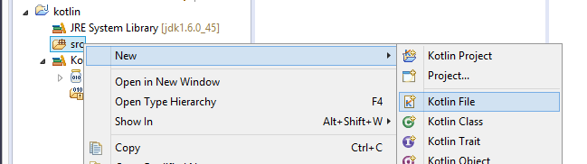 現(xiàn)在準(zhǔn)備創(chuàng)建一個(gè)新的Kotlin項(xiàng)目。打開 Eclipse ,選擇: File -> New -> Kotlin Project 。