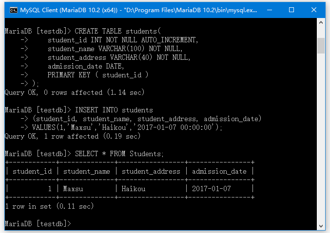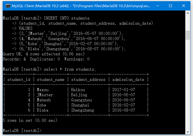 讓我們向students表中插入一些數(shù)據(jù)。如果還沒有創(chuàng)建students表,請參考: http://www.yiibai.com/mariadb/mariadb-create-table.html