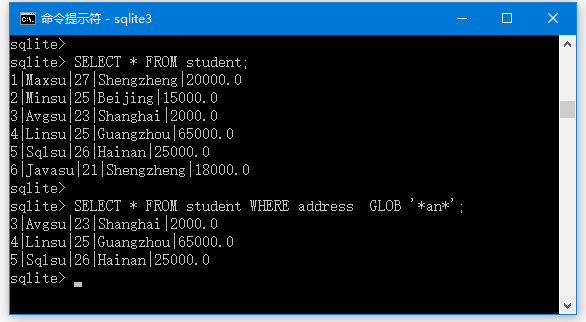 SQLite GLOB操作符通過使用通配符將模式表達(dá)式與文本值匹配, 當(dāng)搜索表達(dá)式與模式表達(dá)式匹配時(shí),GLOB運(yùn)算符將返回真,該值為:1。