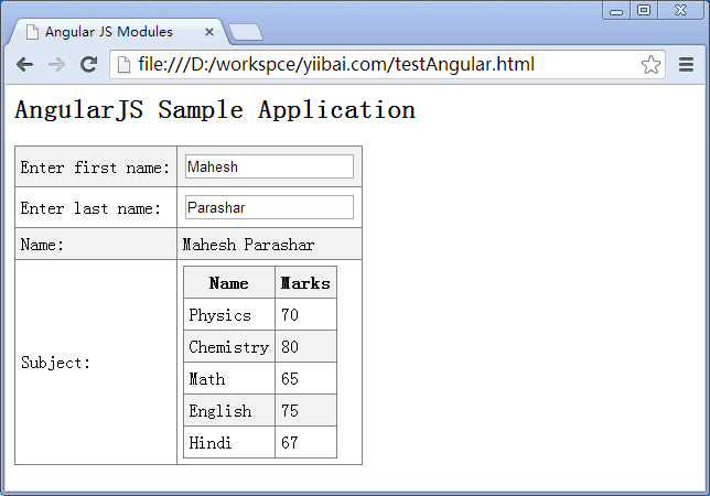 在這里,我們使用 ng-app 指令和控制器采用ng-controller指令應(yīng)用模塊。我們已經(jīng)在主要的HTML頁面導(dǎo)入mainApp.js和studentController.js。
