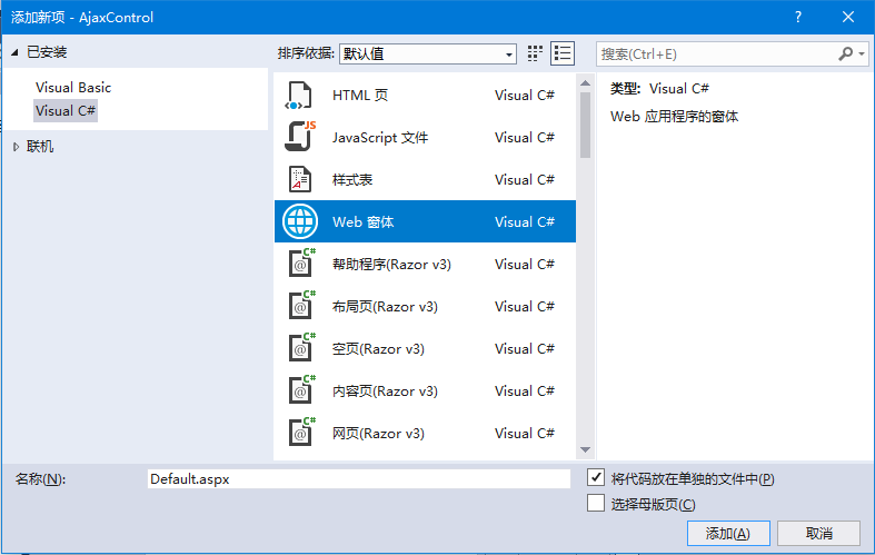 在這個項目名稱上點擊右鍵,在彈出的選項中選擇:添加 -> 添加新項,選擇Web窗體,創(chuàng)建一個文件:Default.aspx, 如下所示 -