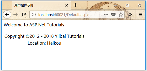 .ascx擴(kuò)展名。<html>,<body>或<form>標(biāo)簽。Page指令。為了理解這個(gè)概念,讓我們創(chuàng)建一個(gè)簡(jiǎn)單的用戶控件,它將作為頁面的頁腳。要?jiǎng)?chuàng)建和使用用戶控件,請(qǐng)執(zhí)行以下步驟: