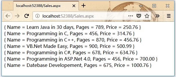 這些子句允許對查詢結(jié)果進行排序。要按照價格查詢書籍的標題,頁數(shù)和價格,請在Page_Load事件處理程序中編寫以下代碼: