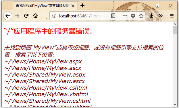 在ASP.NET MVC應(yīng)用程序中,當(dāng)在URL中指定路徑時(shí),可像頁面那樣但不包含對(duì)應(yīng)的任何內(nèi)容直接顯示給用戶。 在ASP.NET MVC應(yīng)用程序中最接近頁面的東西就是視圖。