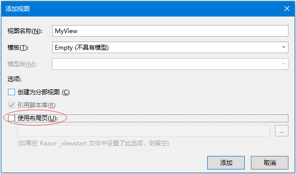 第3步 - 取消選中“使用布局頁面”復(fù)選框,然后單擊“添加”按鈕?,F(xiàn)在新建的這個(gè)視圖內(nèi)有默認(rèn)的代碼。如下所示 -