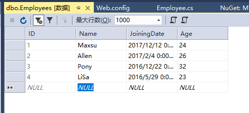 正如所看到的,這個(gè)視圖上沒(méi)有數(shù)據(jù),但是程序已經(jīng)自動(dòng)創(chuàng)建了一個(gè)表:Employee,這是因?yàn)槲覀冞€沒(méi)有在數(shù)據(jù)庫(kù)表中添加任何記錄。