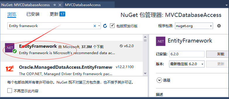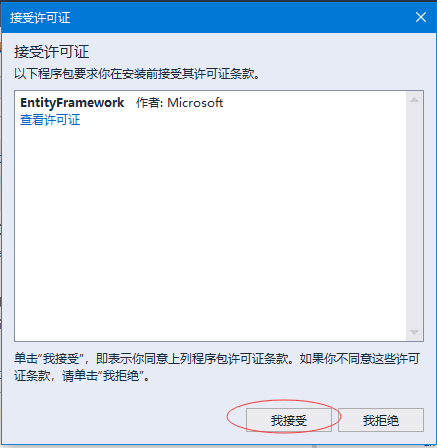 當(dāng)Entity framework框架安裝成功,會(huì)看到下面的截圖中所示的綠色“勾”的圖標(biāo)。如下圖所示 -