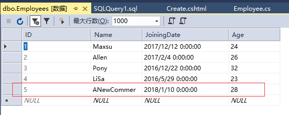 現(xiàn)在打開(kāi)SQL Server對(duì)象資源管理器并刷新數(shù)據(jù)庫(kù)。右鍵單擊Employees表并選擇查看數(shù)據(jù)菜單選項(xiàng)。應(yīng)該就會(huì)看到該記錄被添加到數(shù)據(jù)庫(kù)中了。