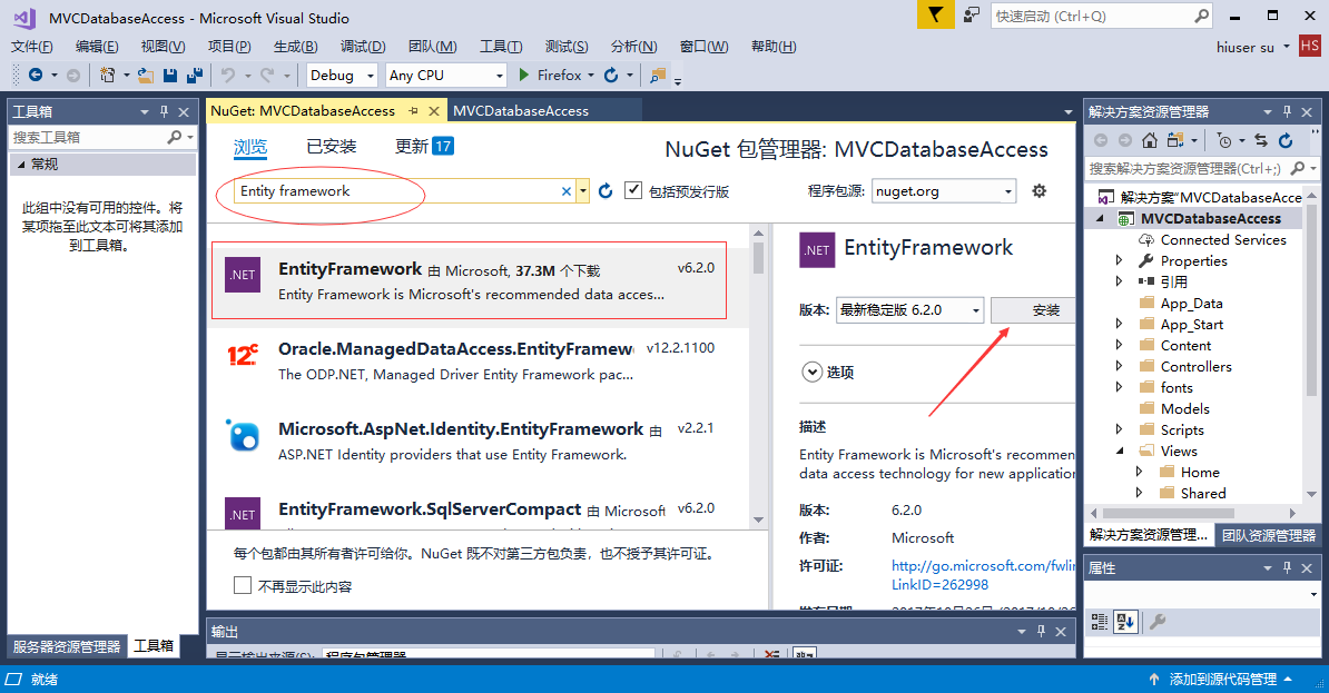 要安裝Entity Framework框架,右鍵單擊項(xiàng)目,然后選擇管理NuGet程序包 ,在彈出的界面中搜索:Entity framework,如下圖所示 -