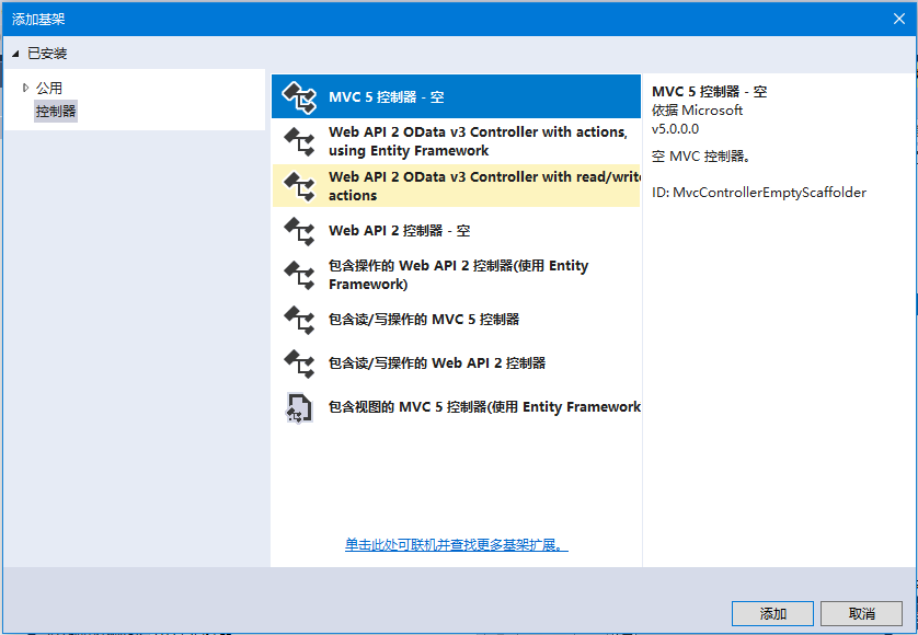 選擇MVC 5控制器 - 空 選項,然后單擊添加 按鈕,然后添加控制器對話框?qū)⒊霈F(xiàn)。