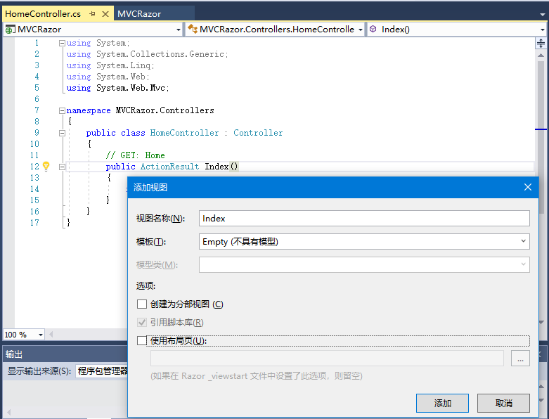 右鍵單擊Index操作方法,然后選擇添加視圖… ,如下所示 -