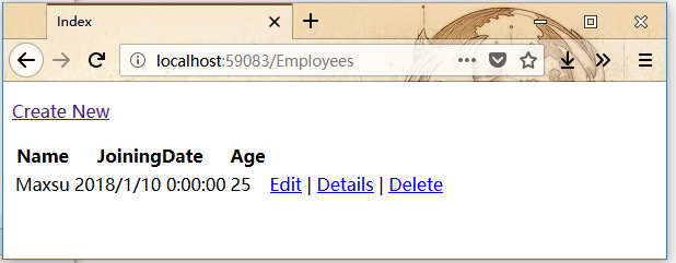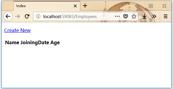 運(yùn)行應(yīng)用程序并使用瀏覽器打開URL: http://localhost:59083/Employees ,將看到以下輸出結(jié)果 -
