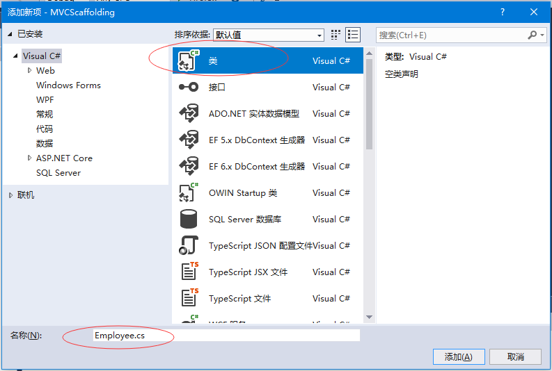 在中間平移中選擇:類,并在名稱字段中輸入:Employee.cs。如下圖所示 -