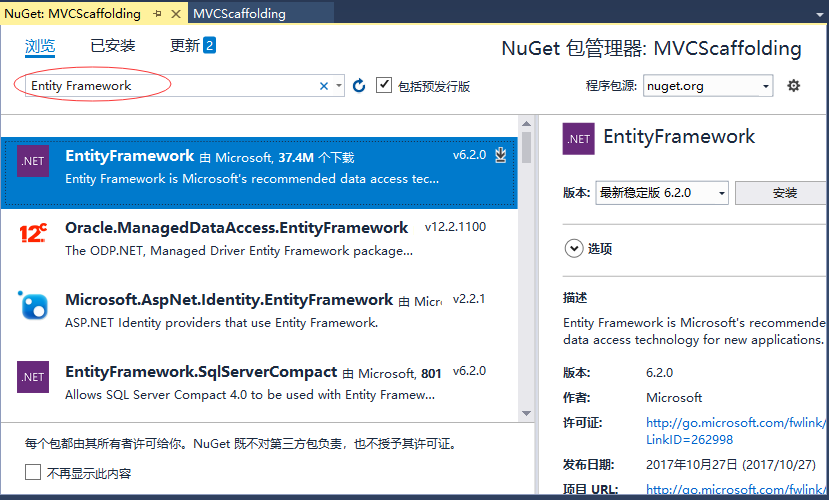 選擇實(shí)體框架(Entity Framework),然后點(diǎn)擊“安裝(Install)” 按鈕。 它將打開預(yù)覽對話框。